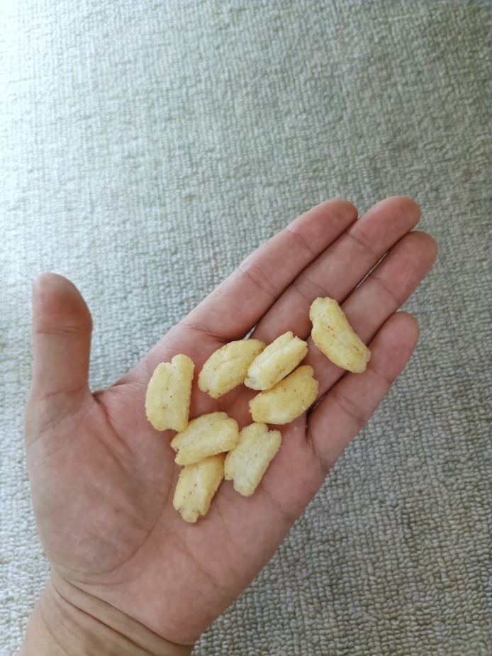 小粒なので食べやすいのはいいポイントですね。袋を開けて口の中にザーッと入れてバリバリ食べるのが美味いです。